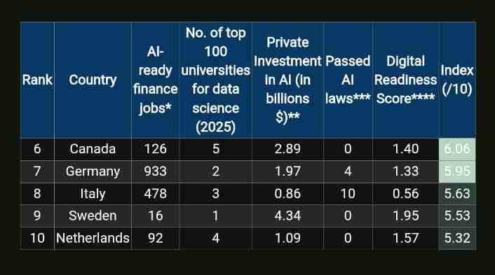 - Italy, while lower in digital readiness, is proactive on the policy front with 10 AI laws and a respectable 478 finance jobs requiring AI expertise.