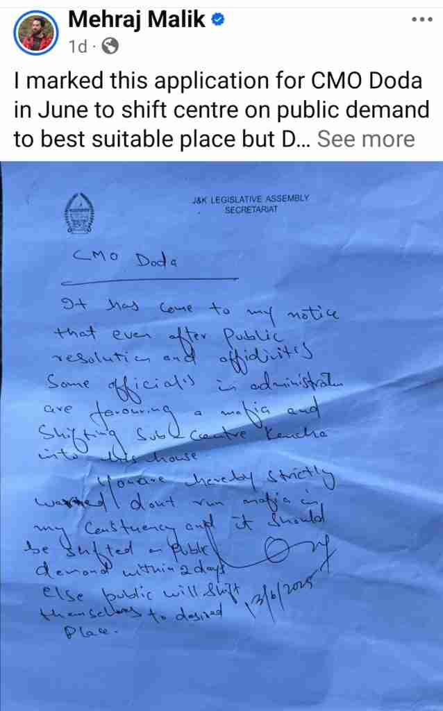 MLA Doda, in his latest Facebook speech, said that he himself had visited the office of the Deputy Commissioner Doda Harvinder Singh, and also submitted a public resolution showing the public demand for relocation of the Health Centre to the building where it now stands. He also attached a copy of that resolution which reads, “I marked this application for CMO Doda in June to shift centre on public demand to the best suitable place but DC wants to favour mafia and shift it to his CHAATUKAAR who comments ‘DC Doda Is Great’ on social media.” Even the copy says, “It has come to my notice that even after public resolution and affidavit, some officials in administration are favouring a mafia and shifting Centre Kencha into his house. You are hereby strictly warned don’t run mafia in Constituency and it should be shifted on public demand within 2 days else the public will shift themselves to the desired place.” The copy also pinpoints the date as 13/06/2025.